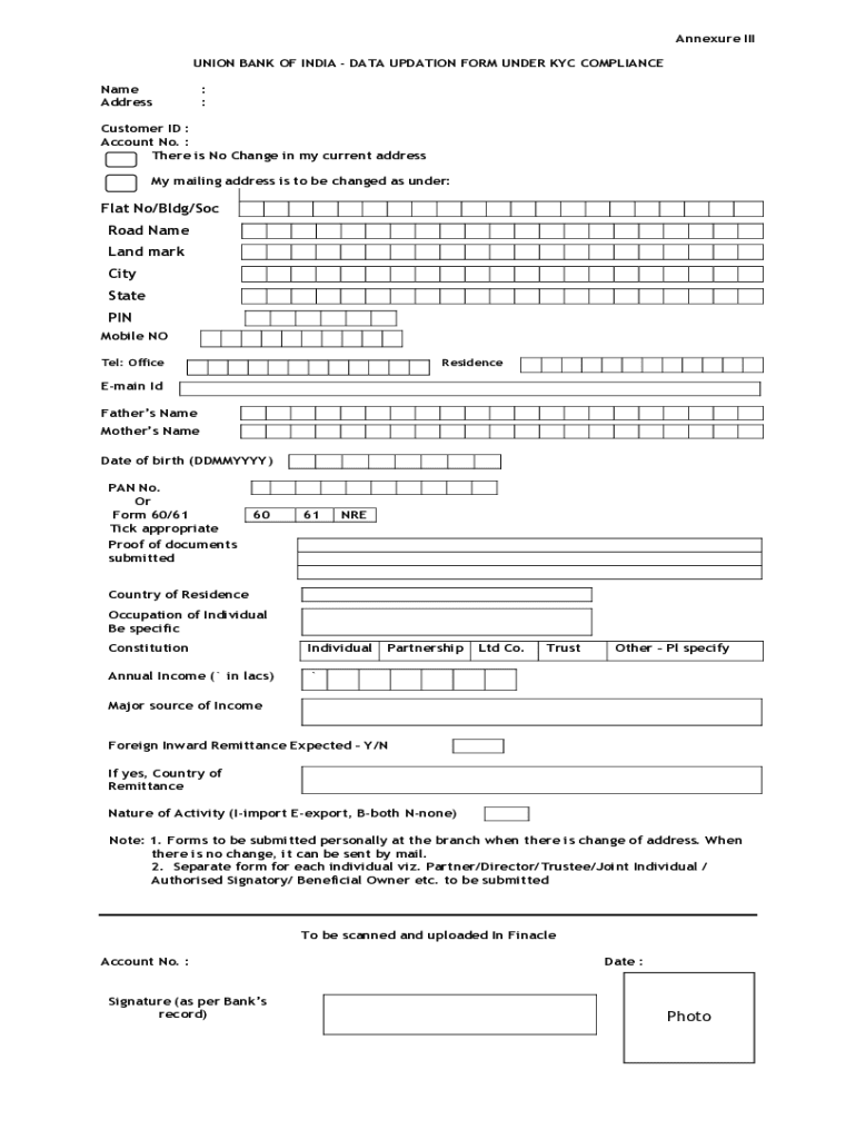 Appendix III UNION BANK OF INDIA DATA Update FORM UNDER KYC COMPLIANCE Name Address: :Customer ID : Account No. There is No Change in my current address My mailing address is to be changed as under:Flat
