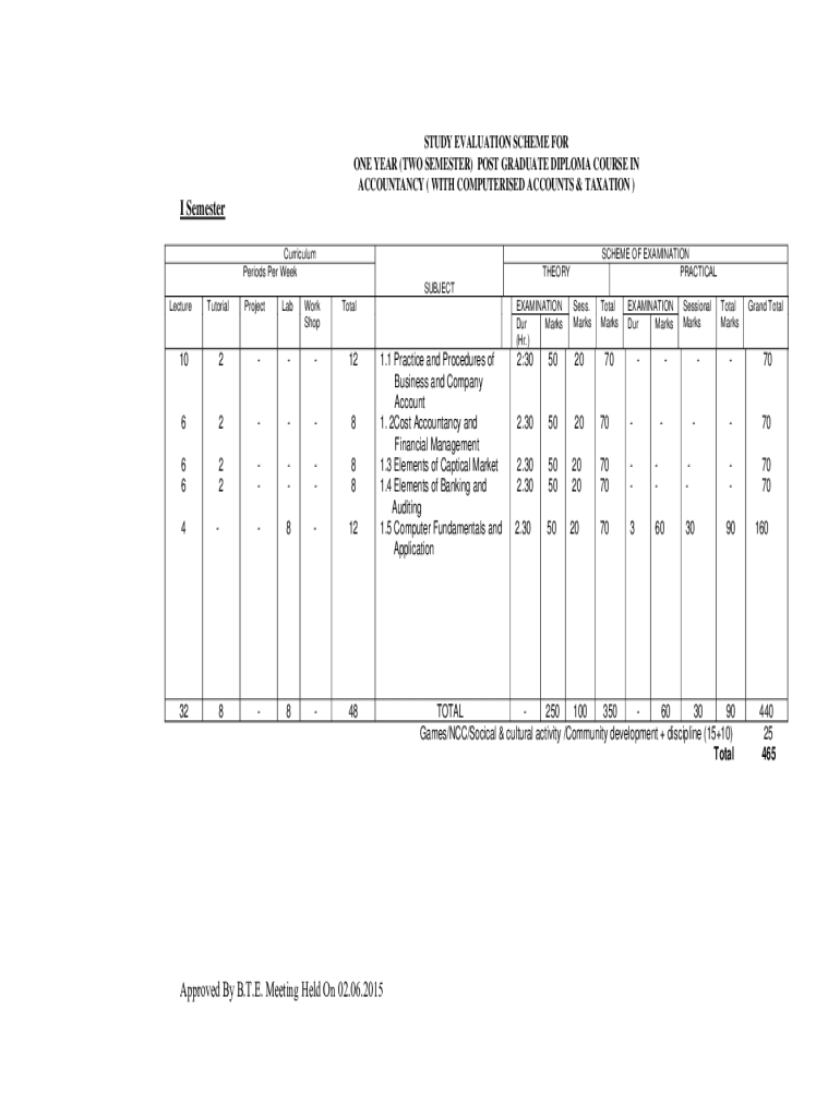 STUDY EVALUATION SCHEME FOR ONE YEAR (TWO SEMESTER) POST GRADUATE DIPLOMA COURSE IN ACCOUNTANCY (WITH Computerized ACCOUNTS & TAXATION)I Semester Curriculum Periods Per WeekSCHEME OF EXAMINATION PRACTICALTHEORY