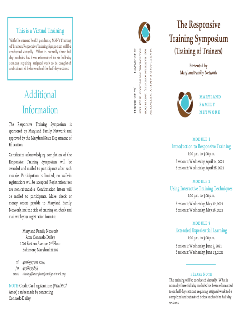The Responsive Training Symposiums is a Virtual Training tel fax email410.659.7701 x274 443.873.5855 cdailey@marylandfamilynetwork.orgNOTE: Credit Card registrations (Visa/MC/ Amex) can be made by