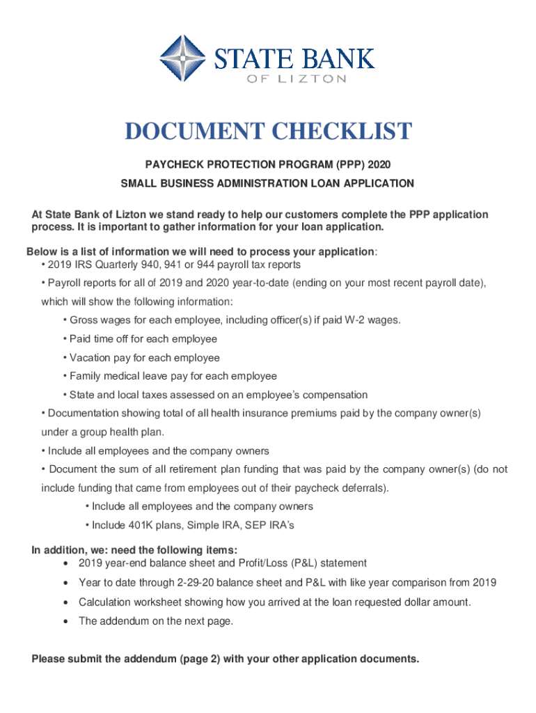 DOCUMENT CHECKLIST PAYCHECK PROTECTION PROGRAM (PPP) 2020 SMALL BUSINESS ADMINISTRATION LOAN APPLICATION At State Bank of Linton we stand ready to help our customers complete the PPP application process.