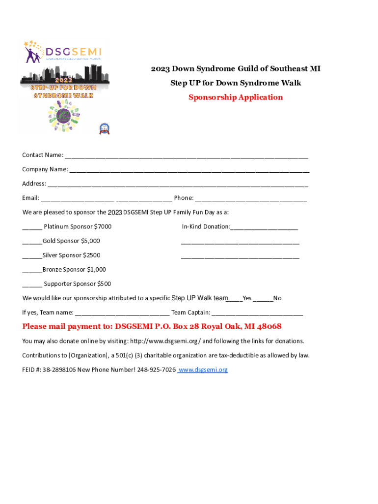 2023 Down Syndrome Guild of Southeast MI Step UP for Down Syndrome Walk Sponsorship ApplicationContact Name: ___ Company Name: ___ Address: ___ Email: ___ Phone: ___ We are pleased to sponsor the