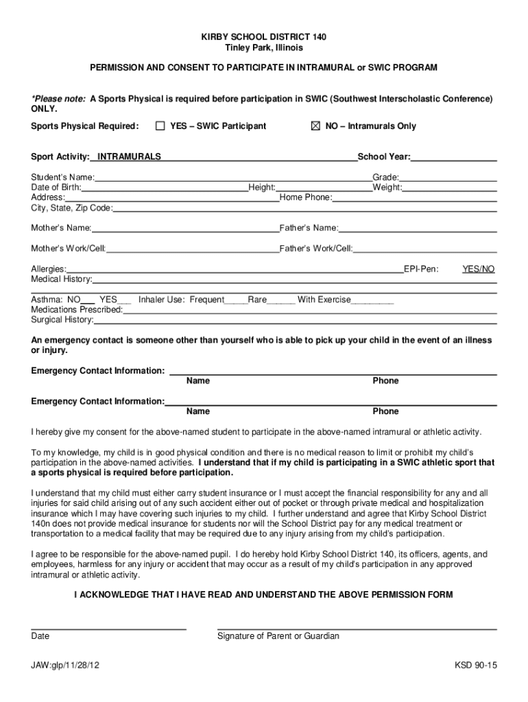 KIRBY SCHOOL DISTRICT 140 Tinley Park, Illinois PERMISSION AND CONSENT TO PARTICIPATE IN INTRAMURAL or SWIM PROGRAM×Please note: A Sports Physical is required before participation in SWIM (Southwest