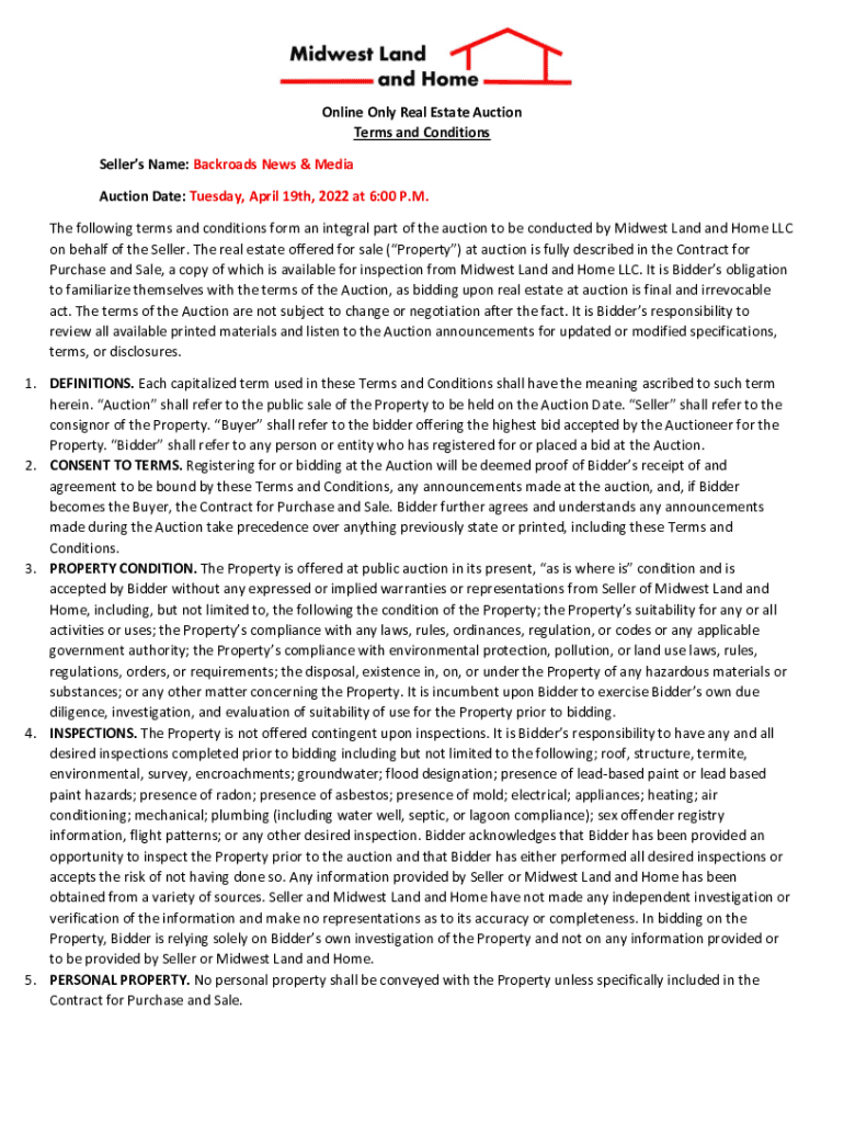 Online Only Real Estate Auction Terms and Conditions Sellers Name: Back roads News & Media Auction Date: Tuesday, April 19th, 2022 at 6:00 P.M. The following terms and conditions form an integral