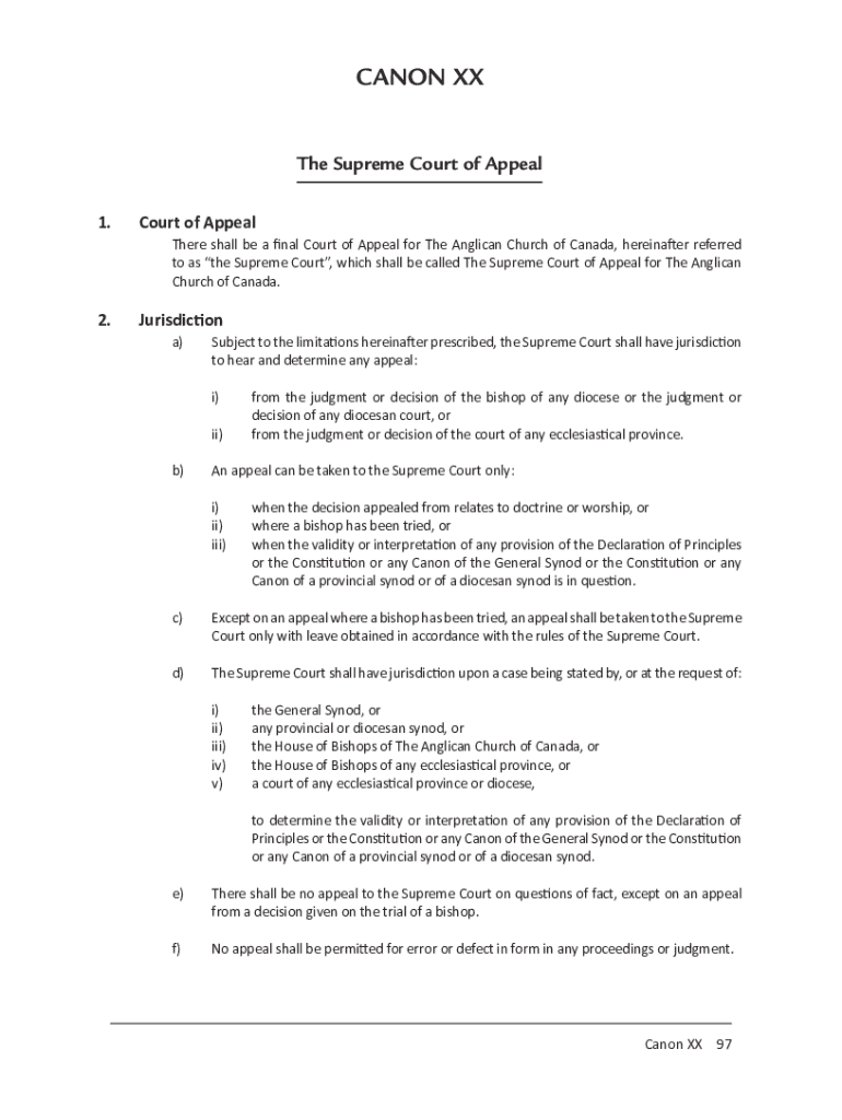 CANON XX The Supreme Court of Appeal 1. Court of Appeal There shall be a final Court of Appeal for The Anglican Church of Canada, hereinafter referred to as the Supreme Court, which shall be called
