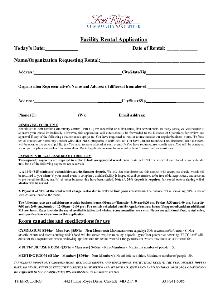 Facility Rental Application Today's Date:Date of Rental: ___Name/Organization Requesting Rental:___ Address:City/State/Disorganization Representatives Name and Address (if different from above):Address:___City/State/Zip___Phone