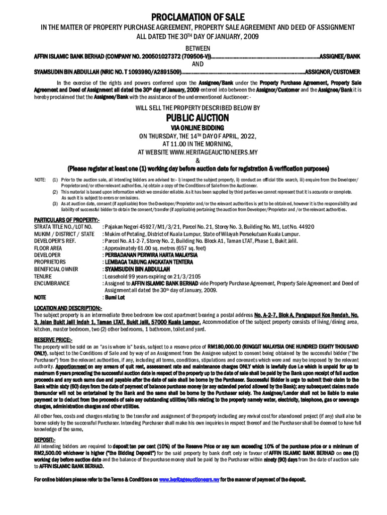 PROCLAMATION OF SALE IN THE MATTER OF PROPERTY PURCHASE AGREEMENT, PROPERTY SALE AGREEMENT AND DEED OF ASSIGNMENT ALL DATED THE 30TH DAY OF JANUARY 2009 BETWEEN AFFINE ISLAMIC BANK BROAD (COMPANY
