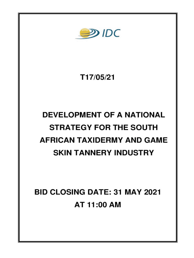 T17/05/21DEVELOPMENT OF A NATIONAL STRATEGY FOR THE SOUTH AFRICAN TAXIDERMY AND GAME SKIN TANNERY INDUSTRY BID CLOSING DATE: 31 MAY 2021 AT 11:00 Industrial Development CorporationTABLE OF CONTENTSSECTION