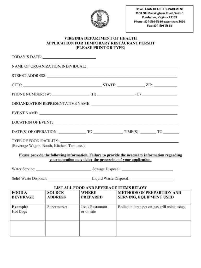 POWHATAN HEALTH DEPARTMENT 3908 Old Buckingham Road, Suite 1 Powhatan, Virginia 23139 Phone: 8045985680 extension: 2609 Fax: 8045985688VIRGINIA DEPARTMENT OF HEALTH APPLICATION FOR TEMPORARY RESTAURANT