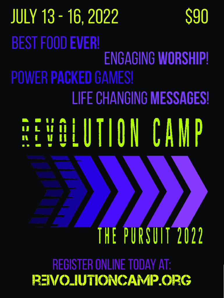 July 13 16, 2022 best food EVER!$90engaging WORSHIP! Power PACKED games! Life changing MESSAGES! Register Online Today at:This page is intentionally left blank.Revolutionary.org Check registration