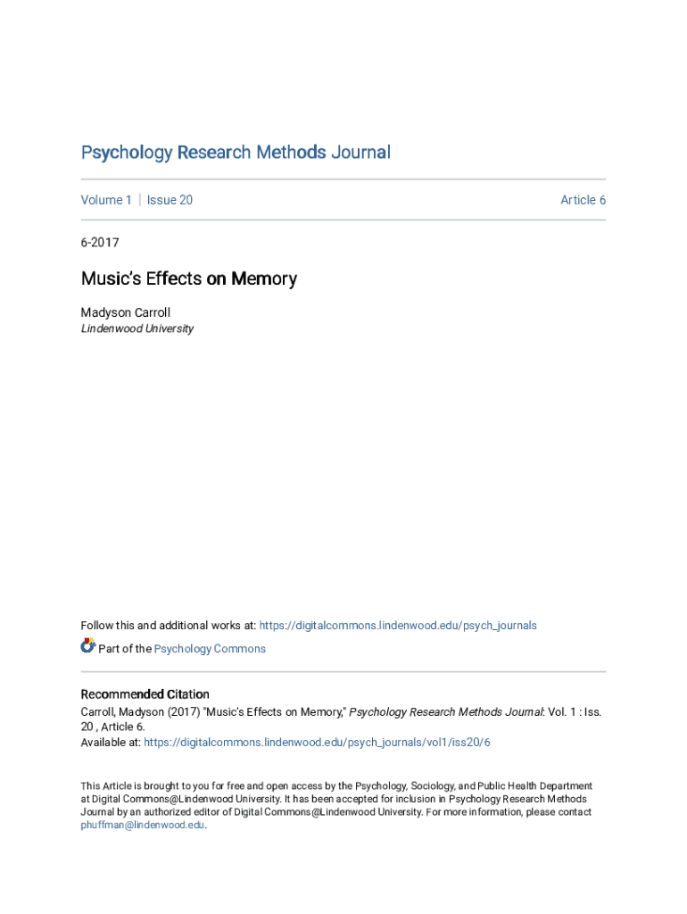 Psychology Research Methods Journal Volume 1Issue 20Article 662017Musics Effects on Memory Madison Carroll Linden wood UniversityFollow this and additional works at: https://digitalcommons.lindenwood.edu/psych_journals