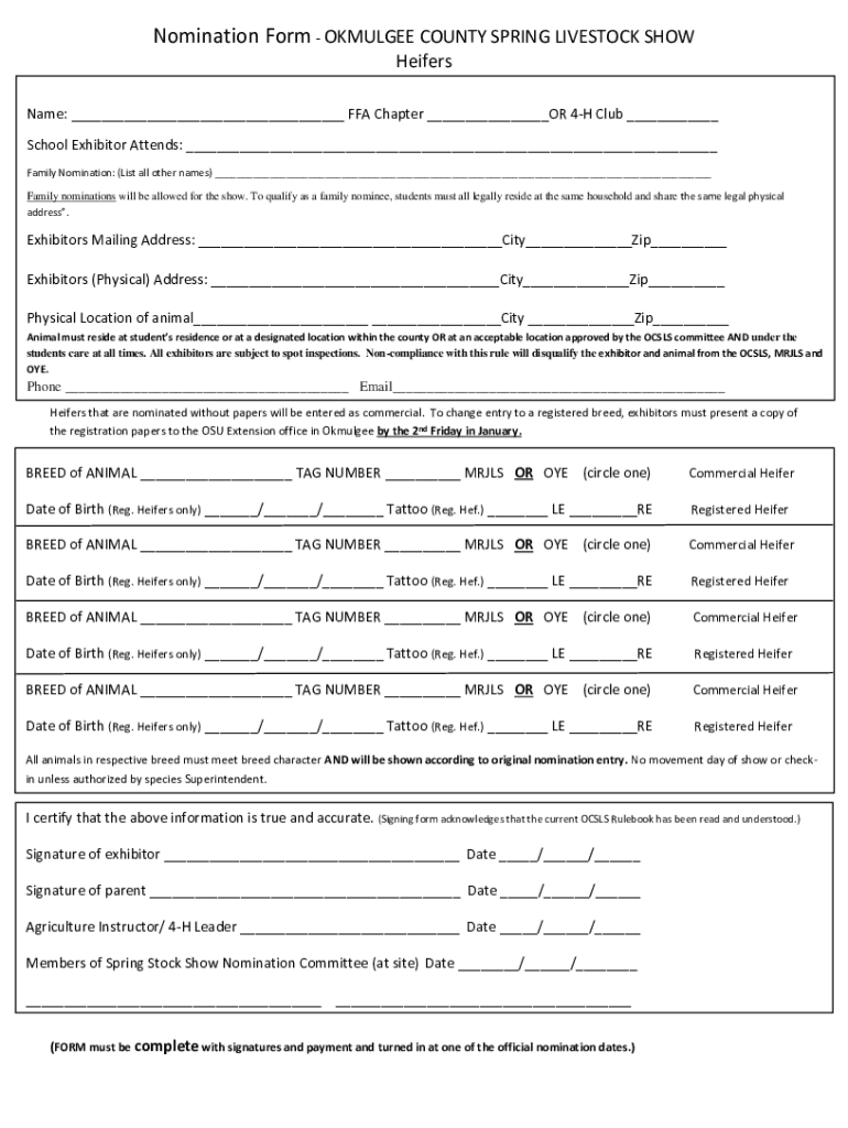 Nomination Form OCMULGEE COUNTY SPRING LIVESTOCK SHOW Heifers Name: ___ FFA Chapter ___OR 4H Club ___ School Exhibitor Attends: ___ Family Nomination: (List all other names) ___ Family nominations