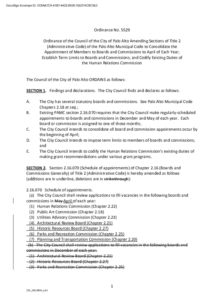 DocuSign Envelope ID: 0C6AB7C647B7442285587EE07AC8C0E3Ordinance No. 5529 Ordinance of the Council of the City of Palo Alto Amending Sections of Title 2 (Administrative Code) of the Palo Alto Municipal