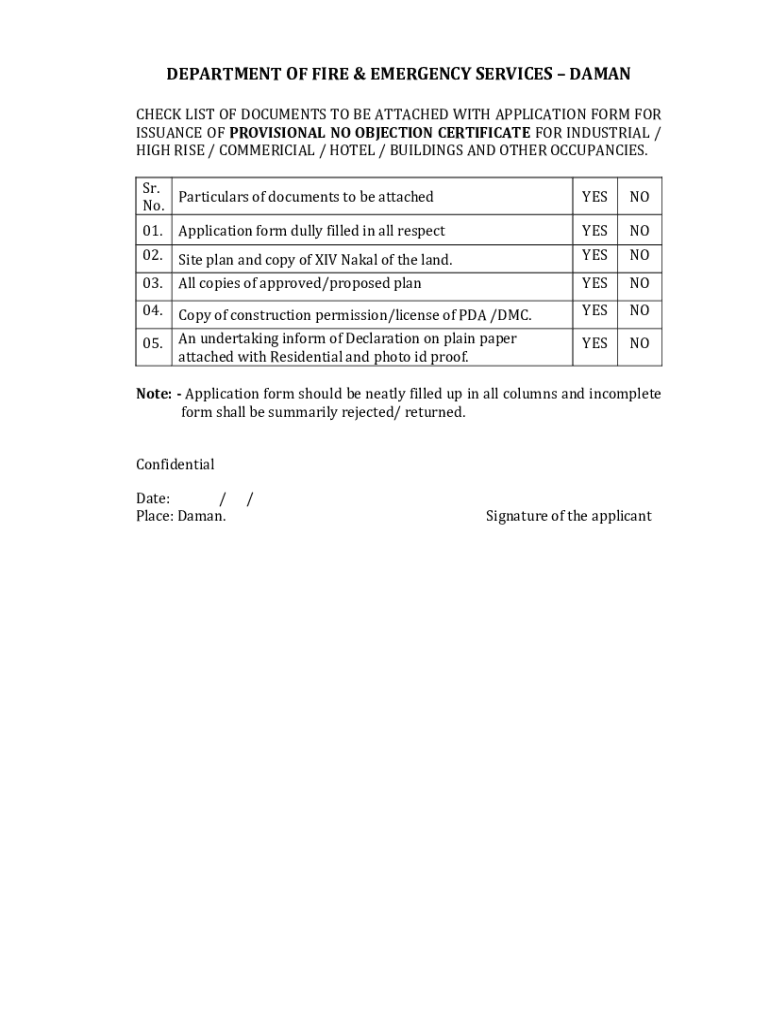 DEPARTMENT OF FIRE & EMERGENCY SERVICES DAMON CHECK LIST OF DOCUMENTS TO BE ATTACHED WITH APPLICATION FORM FOR ISSUANCE OF PROVISIONAL NO OBJECTION CERTIFICATE FOR INDUSTRIAL / HIGH RISE / COMMERCIAL