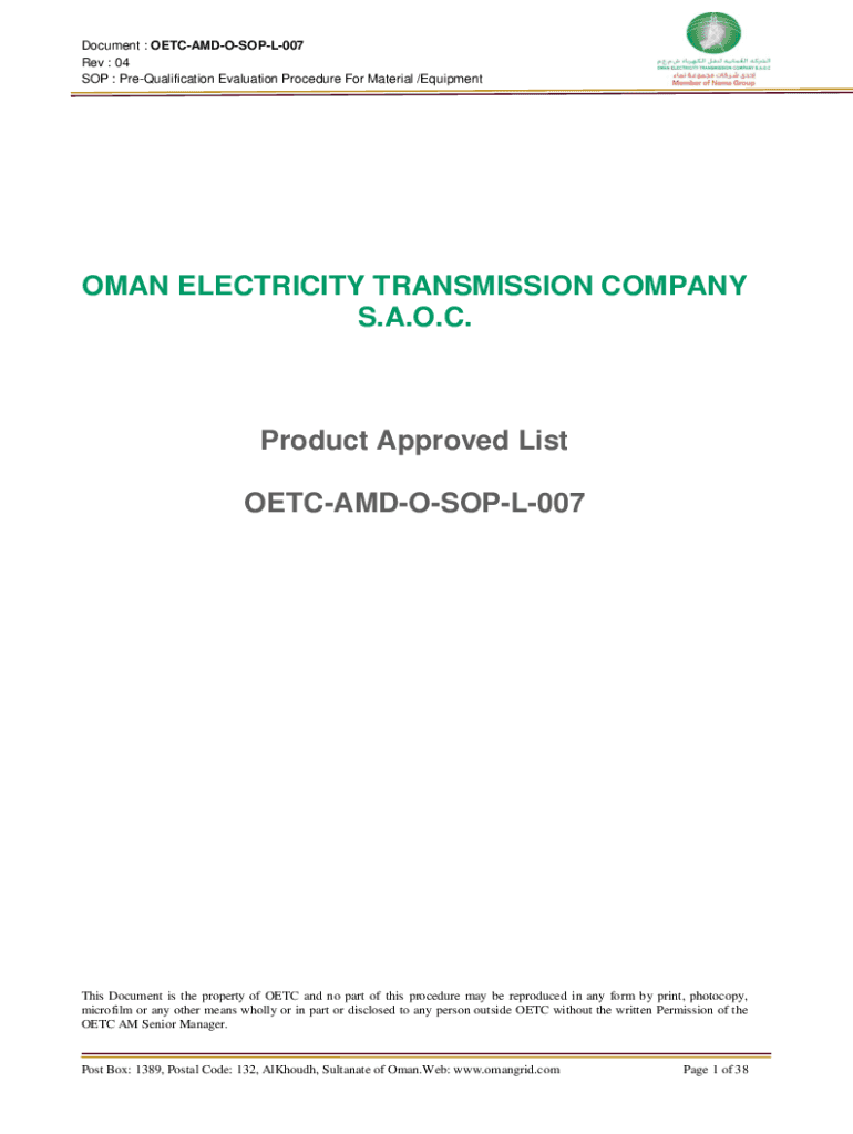 Document : OETCAMDOSOPL007 Rev : 04 SOP : PreQualification Evaluation Procedure For Material /EquipmentOMAN ELECTRICITY TRANSMISSION COMPANY S.A.O.C. Product Approved List OETCAMDOSOPL007This Document