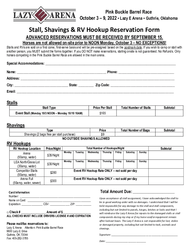 Pink Buckle Barrel Race October 3 9, 2022 Lazy E Arena Guthrie, OklahomaStall, Shavings & RV Hookup Reservation Form ADVANCED RESERVATIONS MUST BE RECEIVED BY SEPTEMBER 15. Horses are not allowed