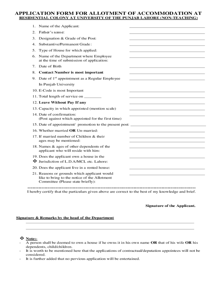 APPLICATION FORM FOR ALLOTMENT OF ACCOMMODATION AT RESIDENTIAL COLONY AT UNIVERSITY OF THE PUNJAB LAHORE (TEACHING) 1. Name of the Applicant:___2. Fathers name:___3. Designation & Grade of the Post:___4.