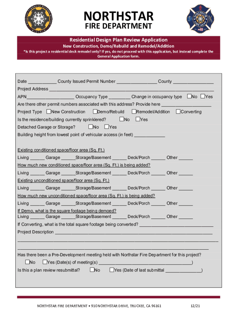 NORTH STAR FIRE DEPARTMENTResidential Design Plan Review Application Construction, Demo/Rebuild and Remodel/Addition *Is this project a residential deck remodel only? If yes, do not proceed with this
