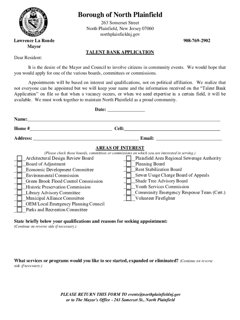 Borough of North Plainfield 263 Somerset Street North Plainfield, New Jersey 07060 northplainfieldnj.gov Lawrence La Rode Mayor9087692902 TALENT BANK APPLICATIONDear Resident: It is the desire of
