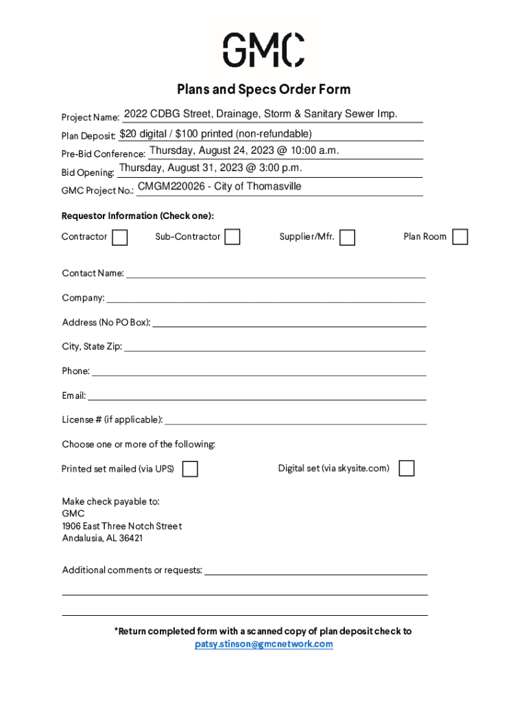 ADVERTISEMENT FOR BIDS Sealed bids, subject to the conditions contained herein, will be received by the City of Thomasville until 3:00 P.M., local time, Thursday, August 31, 2023, and then publicly