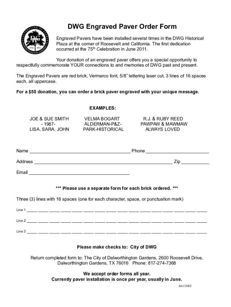 DWG Engraved Paver Order Form Engraved Pavers have been installed several times in the DWG Historical Plaza at the corner of Roosevelt and California. The first dedication occurred at the 75th Celebration