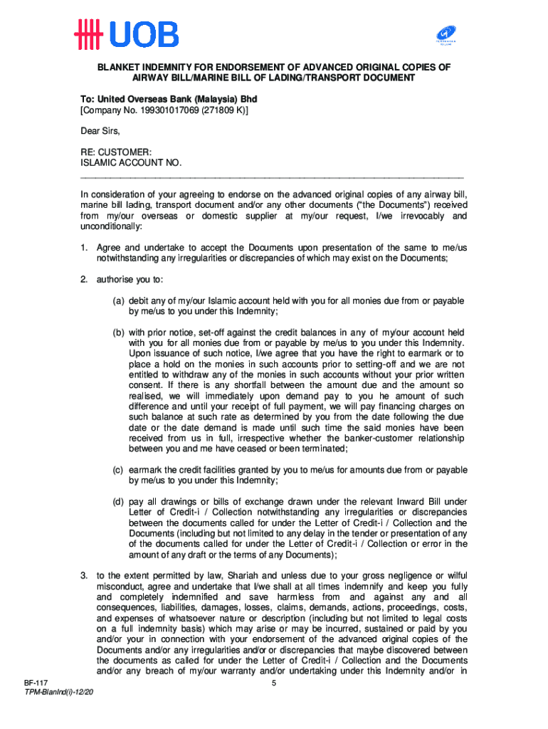 BLANKET INDEMNITY FOR ENDORSEMENT OF ADVANCED ORIGINAL COPIES OF AIRWAY BILL/MARINE BILL OF LADING/TRANSPORT DOCUMENT To: United Overseas Bank (Malaysia) BHD [Company No. 199301017069 (271809 K)]