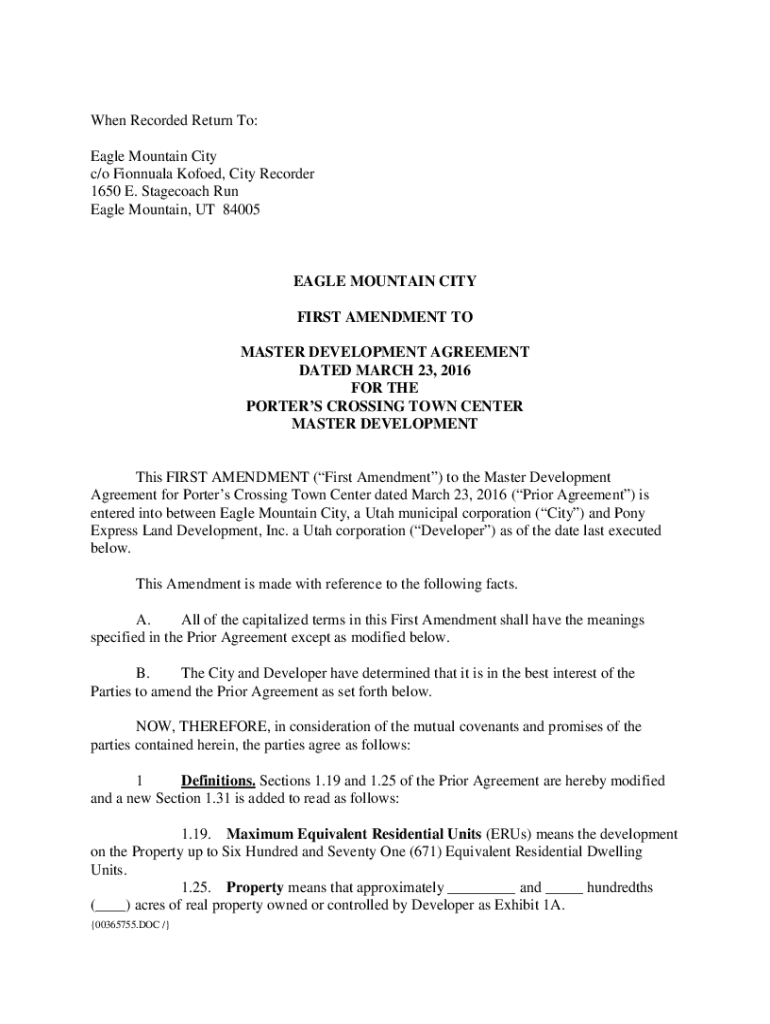 When Recorded Return To: Eagle Mountain City c/o Biannual Roofed, City Recorder 1650 E. Stagecoach Run Eagle Mountain, UT 84005EAGLE MOUNTAIN CITY FIRST AMENDMENT TO MASTER DEVELOPMENT AGREEMENT DATED