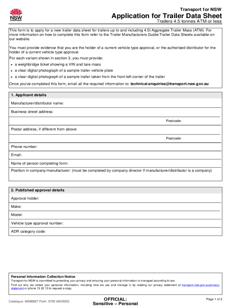 Transport for Application for Trailer Data Sheet Trailers 4.5 tonnes ATM or less This form is to apply for a new trailer data sheet for trailers up to and including 4.5t Aggregate Trailer Mass (ATM).