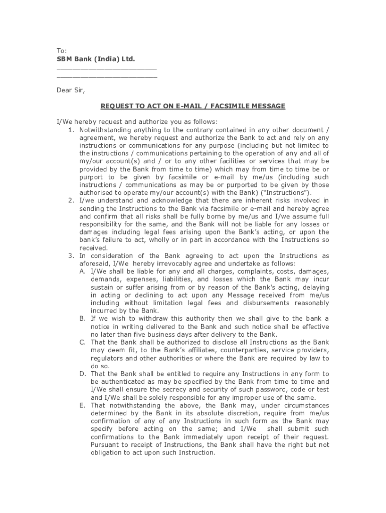 To: SBM Bank (India) Ltd. ___ ___ Dear Sir, REQUEST TO ACT ON EMAIL / FACSIMILE MESSAGE I/We hereby request and authorize you as follows: 1. Notwithstanding anything to the contrary contained in any