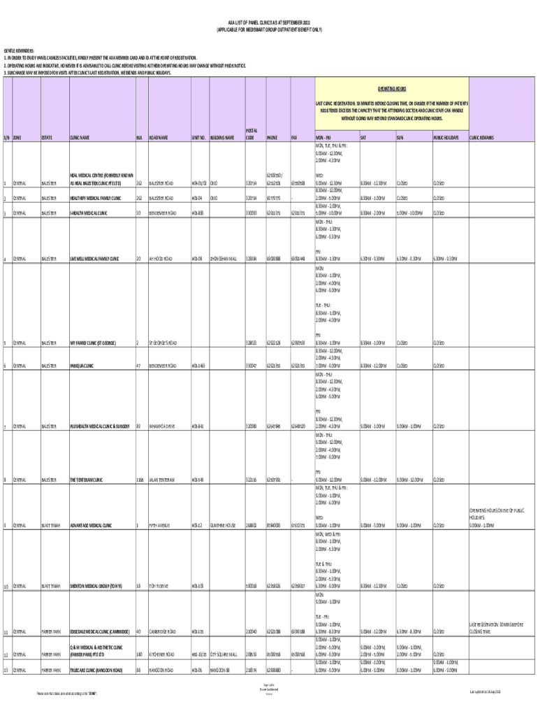 AXA LIST OF PANEL CLINICS AS AT SEPTEMBER 2022 (APPLICABLE FOR MEDICARE GROUP OUTPATIENT BENEFIT ONLY)GENTLE REMINDERS: 1. IN ORDER TO ENJOY PANEL CASHLESS FACILITIES, KINDLY PRESENT THE AXA MEMBER