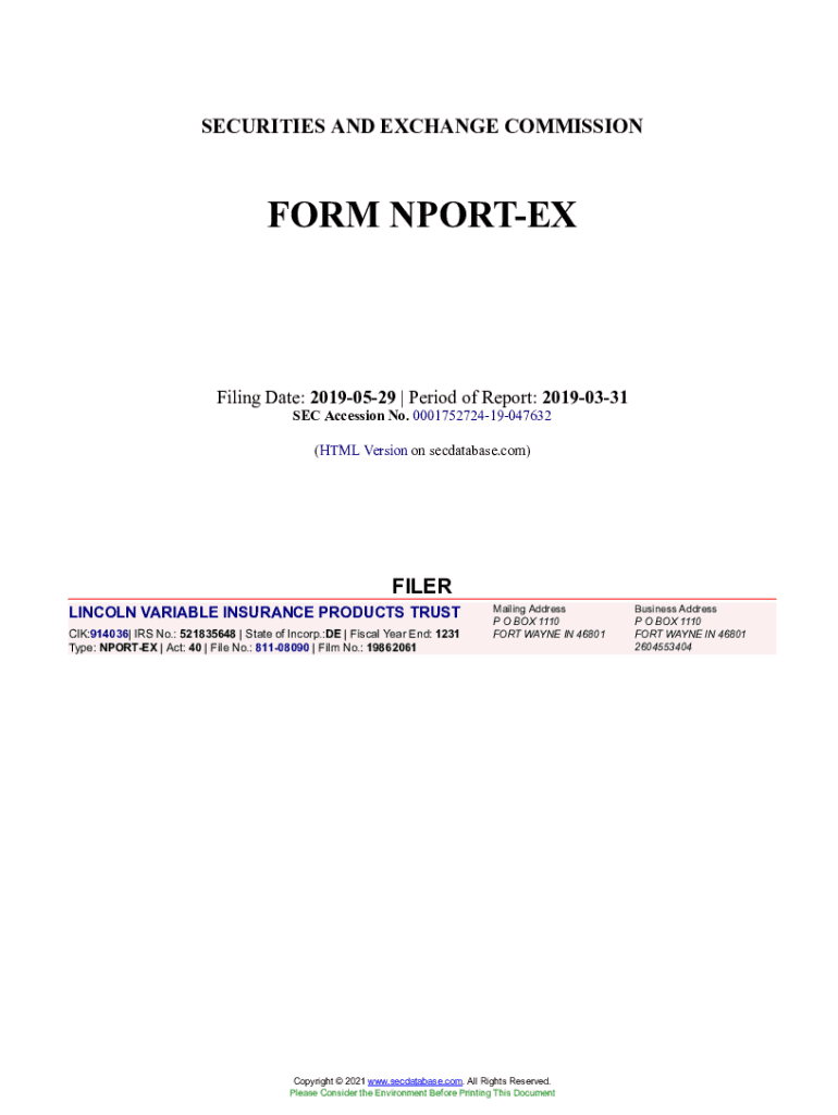 SECURITIES AND EXCHANGE COMMISSIONER NPORTEXFiling Date: 20190529 | Period of Report: 20190331 SEC Accession No. 000175272419047632 (HTML Version on secdatabase.com)FILER LINCOLN VARIABLE INSURANCE