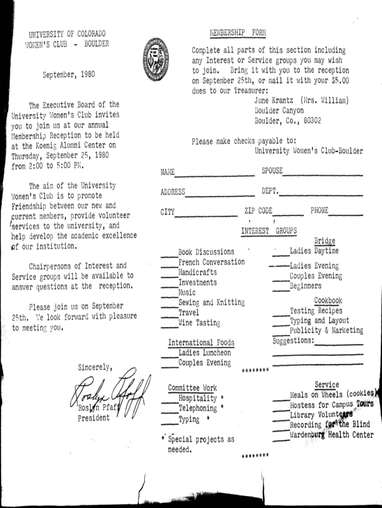 UNIVERSITY OF COLORADO WOMEN\'S CLUB BOULDERMEMBERSHIPComplete all parts of this section including any Interest or Service groups you may wish to join. Bring it with you to the reception on September