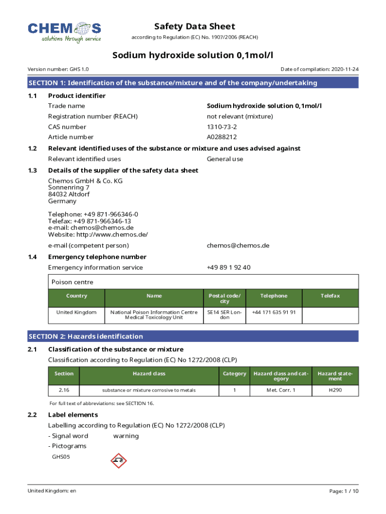 Safety Data Sheet according to Regulation (EC) No. 1907/2006 (REACH)Sodium hydroxide solution 0,1mol/l Version number: GHS 1.0Date of compilation: 20201124SECTION 1: Identification of the substance/mixture