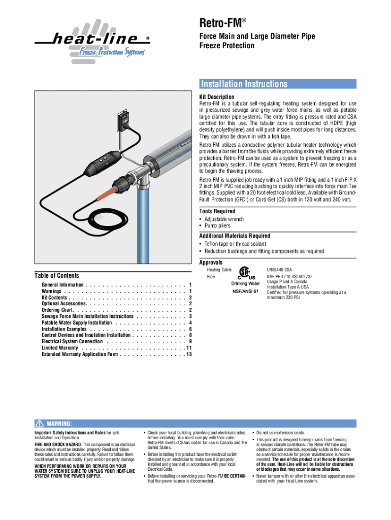 Retro FM Force Main and Large Diameter Pipe Freeze ProtectionInstallation Instructions Kit DescriptionRetroFM is a tubular self-regulating heating system designed for use in pressurized sewage and