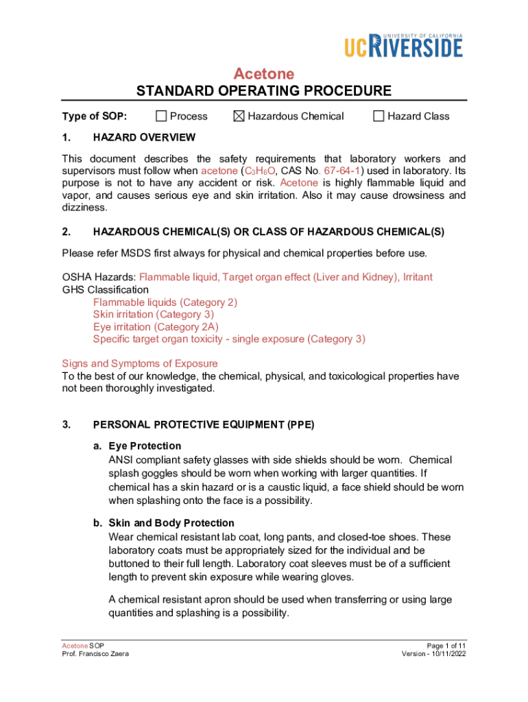 Acetone STANDARD OPERATING PROCEDURE Type of SOP: 1. ProcessHazardous ChemicalHazard ClassHAZARD Overviews document describes the safety requirements that laboratory workers and supervisors must follow