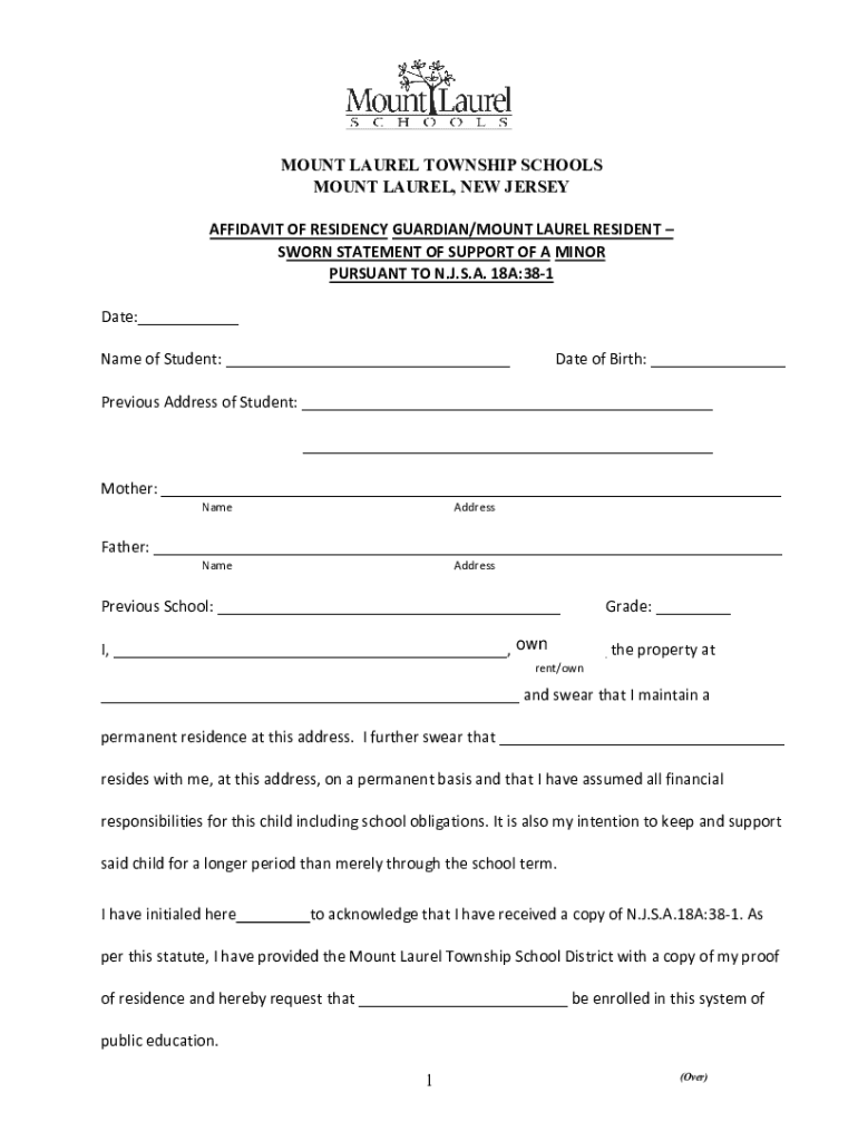 MOUNT LAUREL TOWNSHIP SCHOOLS MOUNT LAUREL, NEW JERSEY AFFIDAVIT OF RESIDENCY GUARDIAN/MOUNT LAUREL RESIDENT SWORN STATEMENT OF SUPPORT OF A MINOR PURSUANT TO N.J.S.A. 18A:381 Date:___ Name of Student: