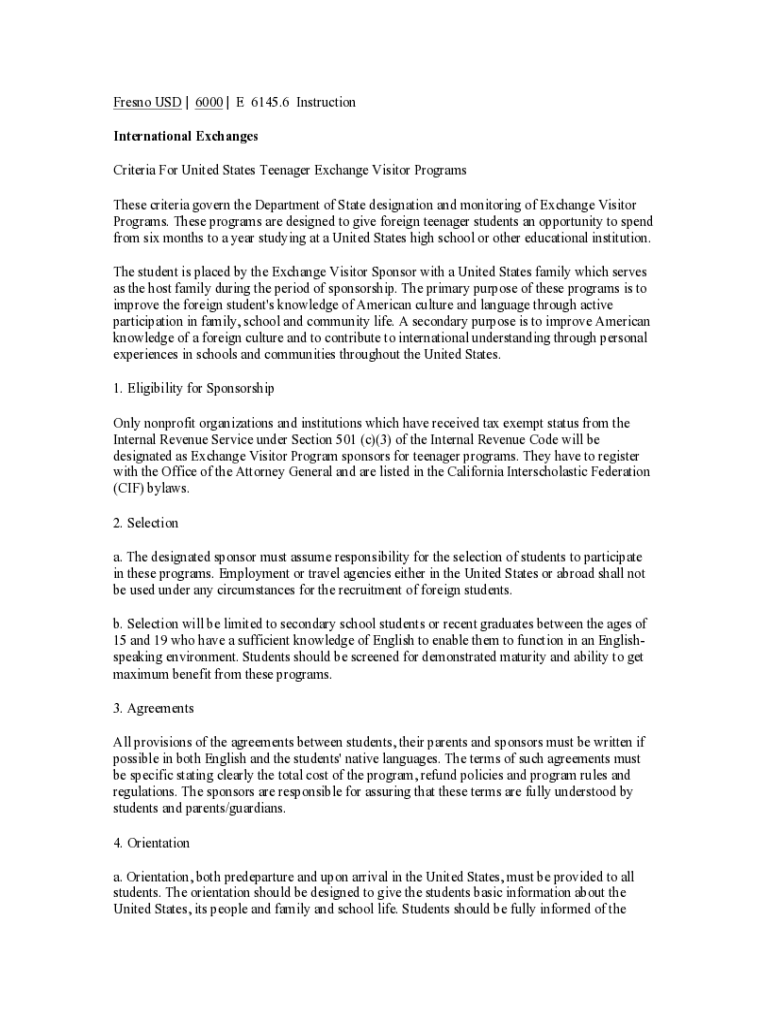 Fresno USD | 6000 | E 6145.6 Instruction International Exchanges Criteria For United States Teenager Exchange Visitor Programs These criteria govern the Department of State designation and monitoring