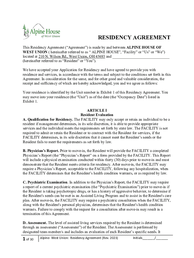 RESIDENCY AGREEMENT This Residency Agreement (Agreement) is made by and between ALPINE HOUSE OF WEST UNION (hereinafter referred to as ALPINE HOUSE, Facility or Us or We) located at 210 N. Wilson
