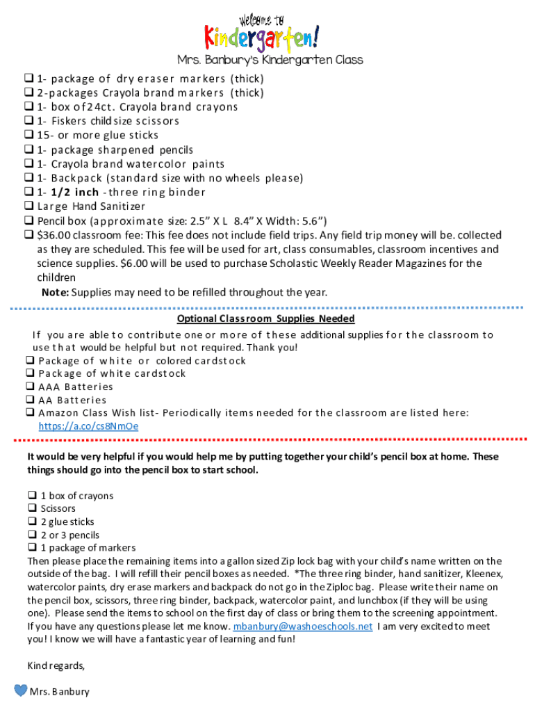 Mrs. Danbury Kindergarten Class 1 package o f dry era s e r markers (thick) 2 packages Crayola brand markers (thick) 1 box o f 24ct. Crayola brand crayons 1 Fishers child size scissors 15 or more