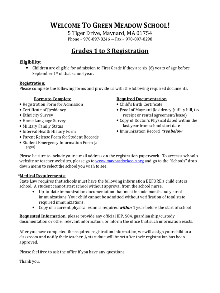 WELCOME TO GREEN MEADOW SCHOOL! 5 Tiger Drive, Maynard, MA 01754 Phone 9788978246 Fax 9788978298Grades 1 to 3 Registration Eligibility: Children are eligible for admission to First Grade if they are