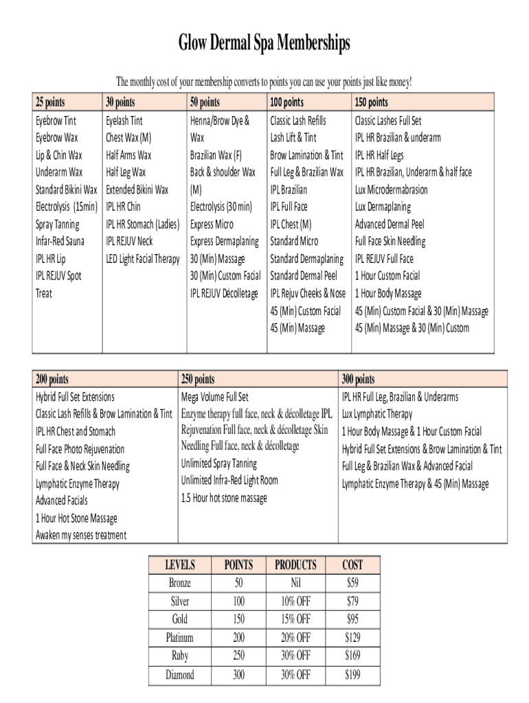 Glow Dermal Spa Memberships 25 points Eyebrow Tint Eyebrow Wax Lip & Chin Wax Underarm Wax Standard Bikini Wax Electrolysis (15min) Spray Tanning Infrared Sauna IP LHR Lip ILL REV Spot Treatise monthly