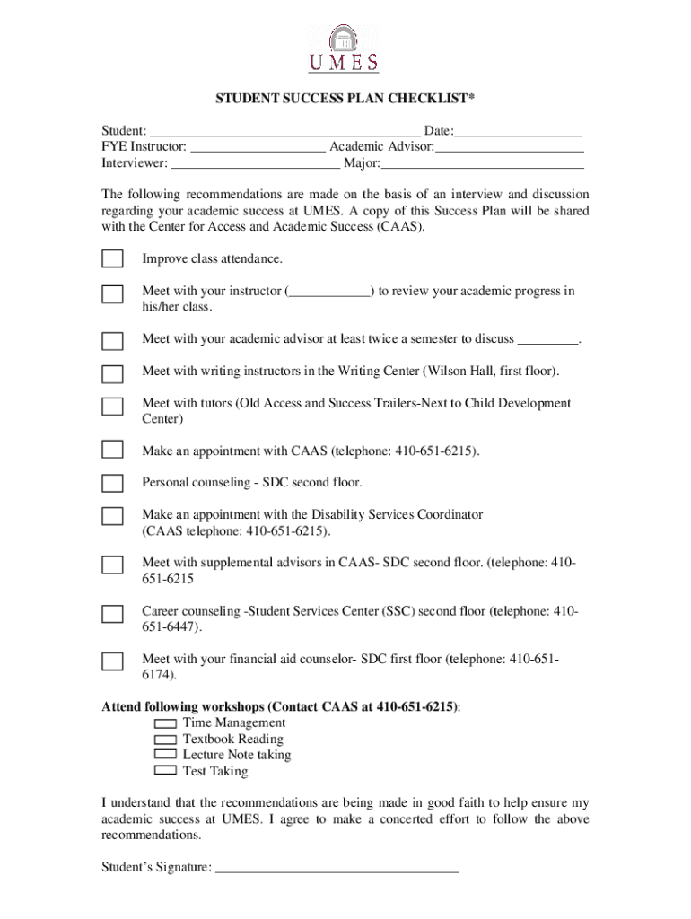 STUDENT SUCCESS PLAN CHECKLIST* Student: ___ Date:___ FYE Instructor: ___ Academic Advisor:___ Interviewer: ___ Major:___ The following recommendations are made on the basis of an interview and discussion