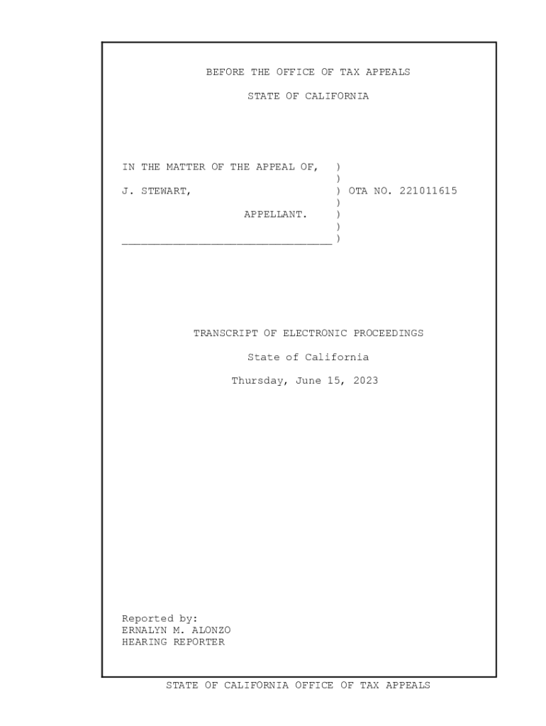 BEFORE THE OFFICE OF TAX APPEALS STATE OF CALIFORNIAN THE MATTER OF THE APPEAL OF,) ) J. STEWART, ) OTA NO. 221011615) APPELLANT. )) ___)TRANSCRIPT OF ELECTRONIC PROCEEDINGS State of California Thursday,