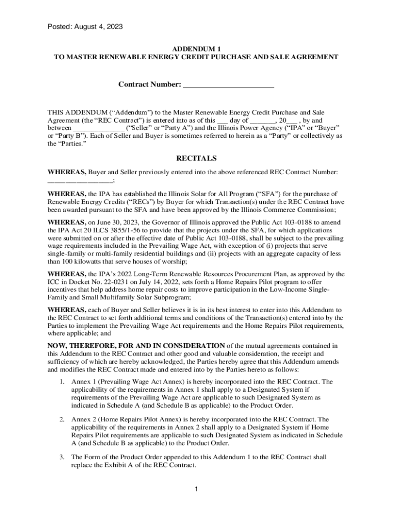 Posted: August 4, 2023, ADDENDUM 1 TO MASTER RENEWABLE ENERGY CREDIT PURCHASE AND SALE AGREEMENTContract Number: ___THIS ADDENDUM (Addendum) to the Master Renewable Energy Credit Purchase and Sale