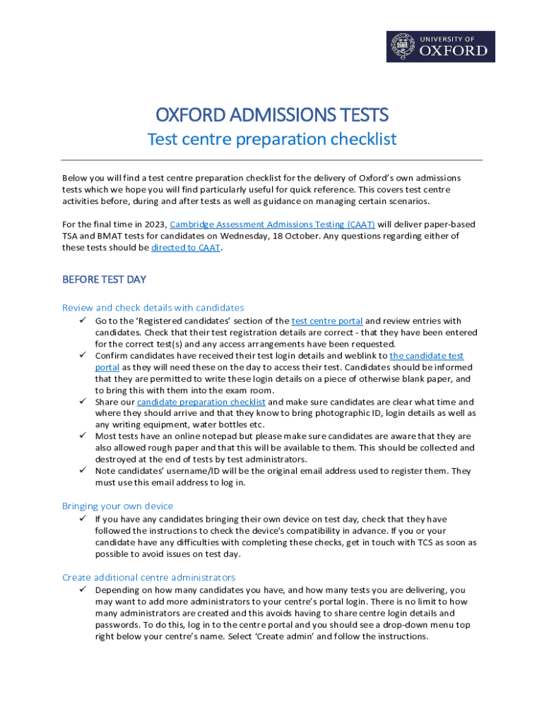 OXFORD ADMISSIONS TESTS Test center preparation checklist Below you will find a test center preparation checklist for the delivery of Oxfords own admissions tests which we hope you will find particularly