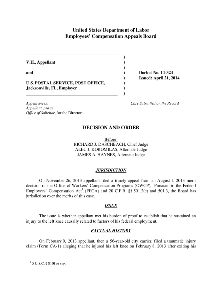 United States Department of Labor Employees Compensation Appeals Board ___ V.H., Appellant and U.S. POSTAL SERVICE, POST OFFICE, Jacksonville, FL, Employer ___))))))))Appearances: Appellant, pro SE