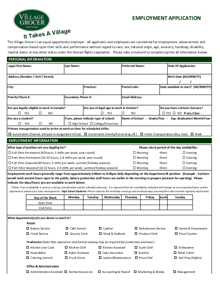 EMPLOYMENT APPLICATION ullage ! I V A s e It Takes Village Grocer is an equal opportunity employer. All applicants and employees are considered for employment, advancement and compensation based upon