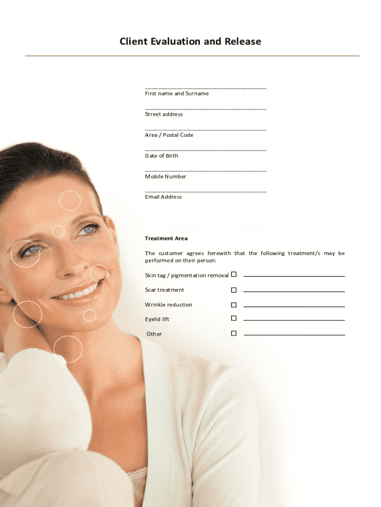 Client Evaluation and Release___ First name and Surname ___ Street address ___ Area / Postal Code ___ Date of Birth ___ Mobile Number ___ Email AddressTreatment Area The customer agrees herewith that