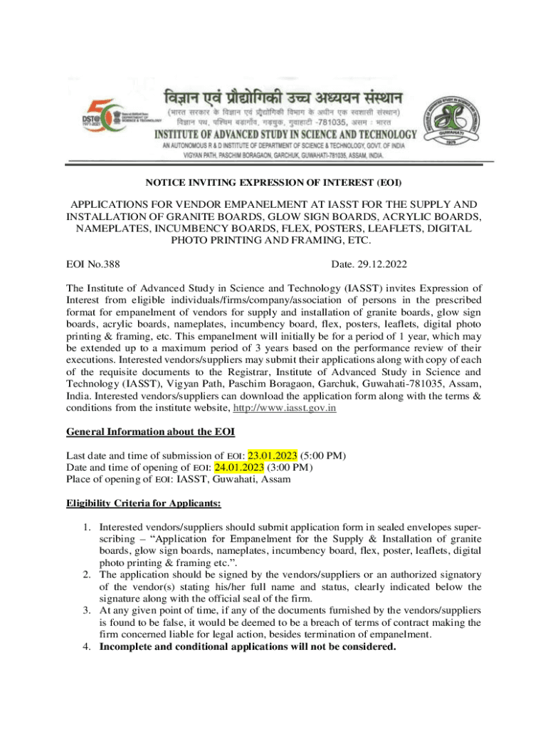 NOTICE INVITING EXPRESSION OF INTEREST (EOI)APPLICATIONS FOR VENDOR EMBANKMENT AT ASST FOR THE SUPPLY AND INSTALLATION OF GRANITE BOARDS, GLOW SIGN BOARDS, ACRYLIC BOARDS, NAMEPLATES, INCUMBENCY BOARDS,