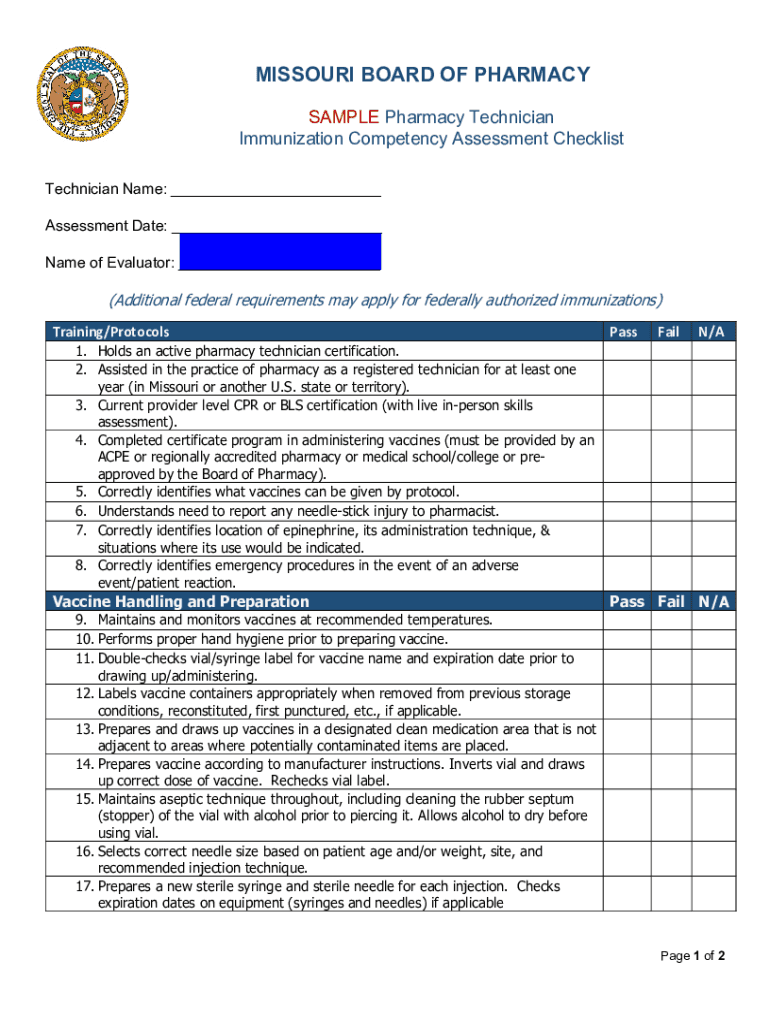 MISSOURI BOARD OF PHARMACY SAMPLE Pharmacy Technician Immunization Competency Assessment Checklist Technician Name: ___ Assessment Date: ___ Name of Evaluator: ___(Additional federal requirements