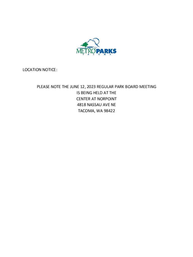 LOCATION NOTICE:PLEASE NOTE THE JUNE 12, 2023, REGULAR PARK BOARD MEETING